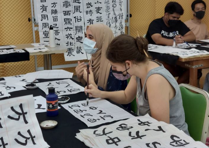 一踏入書法教室,便能看見埋頭寫書法的學生,聞到怡人的墨香。許多人可能會以為,這些興致勃勃、盡情揮毫的學生,都是一群中華子弟。但其實除了華人社員,課堂中還充滿不同國籍如德國、美國、英國、日本的學生。他們對漢字同樣抱有興趣及好奇,渴望學習中華傳統文化,體驗用毛筆記錄文字溫度的過程。此外,社員們在這裡的交談內容,也相當有趣。外籍生會努力使用生澀的中文,與台灣同學交談,分享他們在台灣的所見所聞,以及彼此的文化差異。而台灣同學除了教導他們一些中文發音外,也樂於介紹台灣的文化習俗。