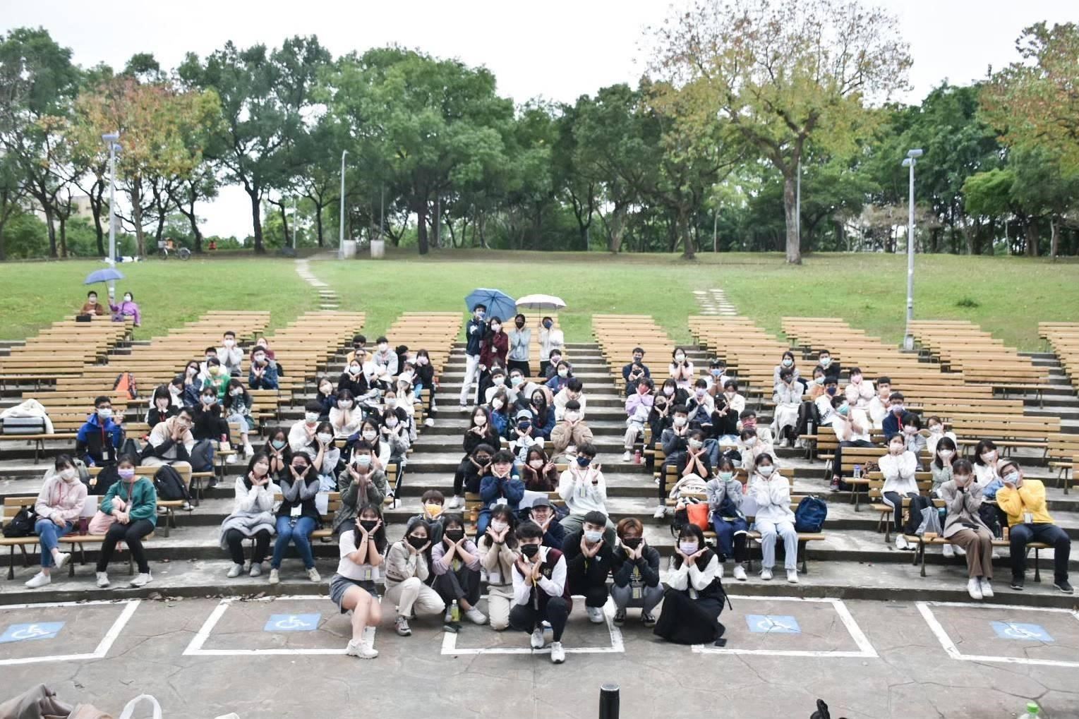 營隊在大安森林公園進行闖關遊戲,結束後全員拍攝大合照。/李浩然攝