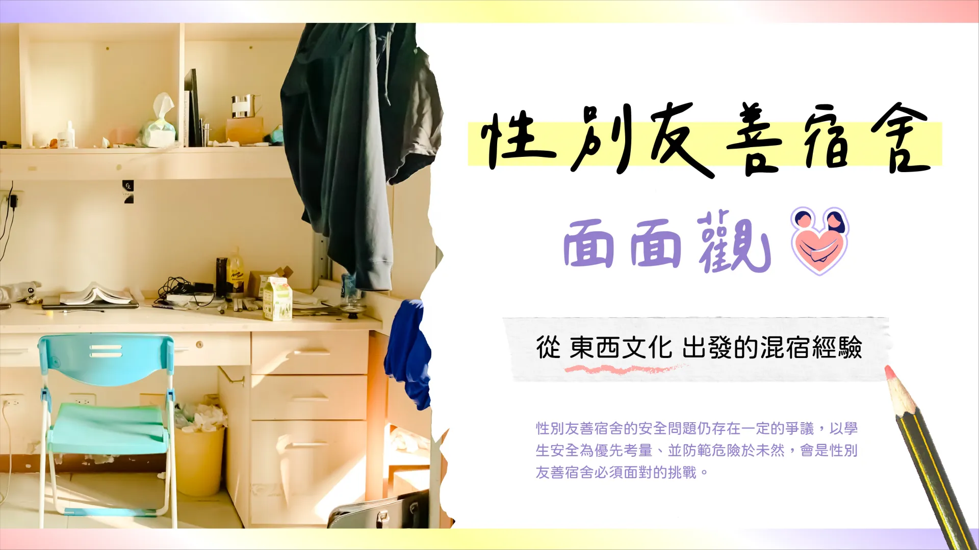 就讀教育學系二年級的楊艾昕曾在中國求學時體驗過性別友善宿舍。身為馬來西亞華僑的她,被問起對於性別平等宿舍的看法時表示贊同。提及三年前在中國混宿的經驗,楊艾昕認為男女混宿是一個相對來說普遍的事情。然而在她的國家,性別友善宿舍可沒那麼簡單。「由於宗教因素,性別友善宿舍在馬來西亞不太常見。」 雖然從小生長在一個對於性別議題較為敏感、立場保守的國家,楊艾昕仍舊認為居住在性別友善宿舍並非是一件不可接受的事情。「租房子有時一樣會遇到男女混居的問題。」楊艾昕說,從學生租屋族的角度出發,住在性別友善宿舍其實與在外租屋無多大區別,她不會特別要求鄰居的性別必須是同性。