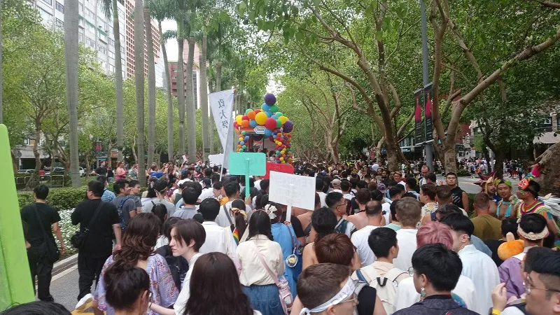 On Saturday, students took the bus from campus to Taipei City Hall before heading to the parade assembly point in front of the main stage. A multitude of organizations and nonprofits held booths along the entrance, including Taiwan Love & Hope Association and Amnesty International. Other regional organizations were in attendance such as Kyushu Rainbow Pride from Japan. Attendees waved their rainbow flags, drag queens walked the grounds with dazzling makeup, and musicians and organizations took to the main stage- serenading the crowd or sharing information on resources for the queer community. At 2 pm, the parade march commenced, where parade floats blasted music to an energetic crowd. The NCCU gender studies club held its banner high while marching down the packed streets.