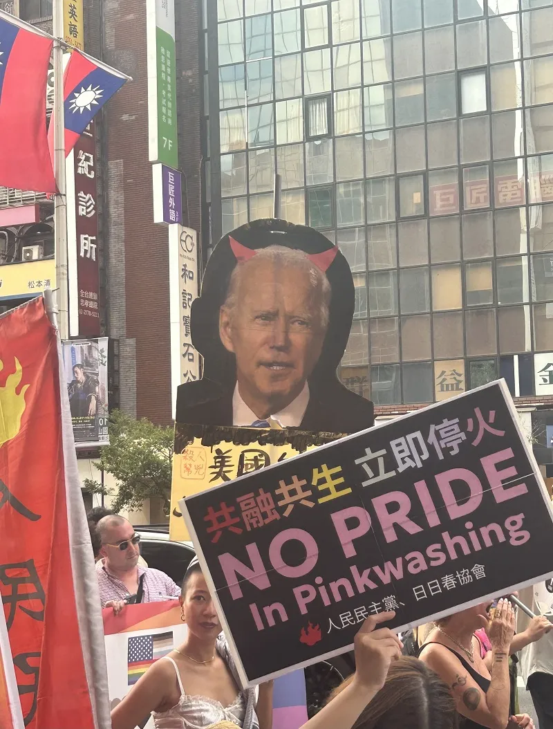 ▲遊行中,人們透過各種舉牌標語表達訴求,有人高舉印有美國總統喬·拜登的牌子/Soolim提供