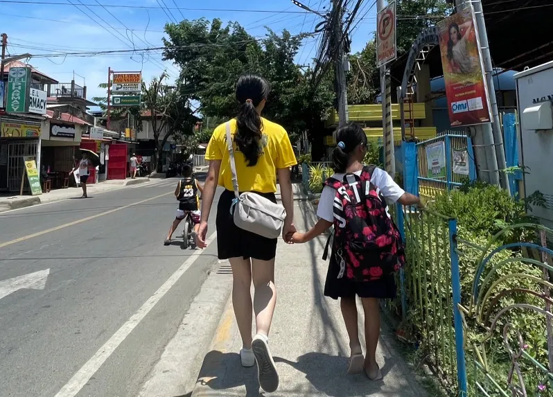 ▲在菲律賓的街頭,沂臻牽著孩子的手,一起走路去上學