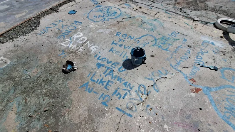 ▲菲律賓的孩子們用剩餘的油漆在地上寫下志工的名字