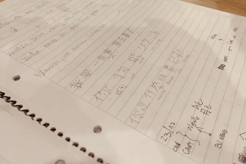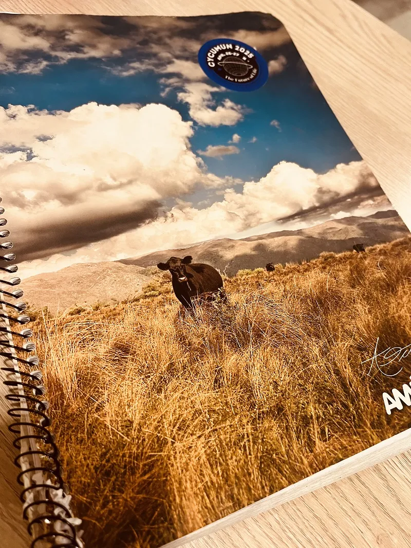 和小筆記本一樣,Diaz使用一慣熟悉的紙筆紀錄生活點滴。這本大筆記和Diaz一樣來自阿根廷,封面上有家鄉的風景,還有一隻獨立佇立在草原中的牛。筆記本充滿使用的痕跡與風霜,內容則是Diaz從第一天到台灣至今的所有學習筆記:從最初如何寫自己的中文名字,到遠距大學考試的西班牙文註解,記載他在台灣學習的點點滴滴。