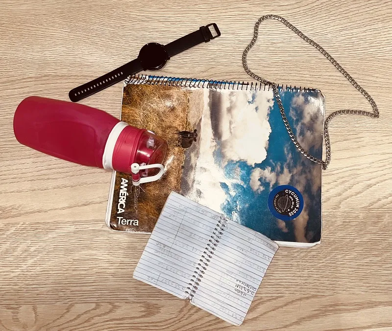 ▲Diaz帶來十件不可或缺之物的其中五件,分別是一隻智慧手錶、一個粉色橡膠水壺、一條不過分雕飾的項鍊、一本寫滿筆記的小筆記本、另一本稍顯磨損的大筆記本。
