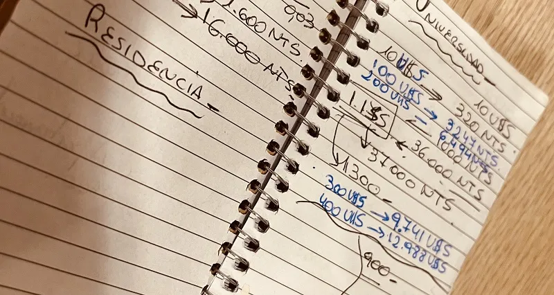 他回想起準備來台灣時,媽媽就是用這本筆記,計算將來在台灣的種種開銷與收入。在筆記的第一頁寫著:「1NTS (編按:Diaz的媽媽把新台幣NTD寫成了NTS)= 0.03USD」,這是媽媽的筆記。為了讓媽媽理解幣別差異,Diaz要把台幣換成美金,再把美金換成阿根廷披索。直到今日,Diaz還在使用這本小筆記本記帳,時間長達150多天,有時候,他也會翻回前面幾頁,回顧或補記各式各樣的小註解。