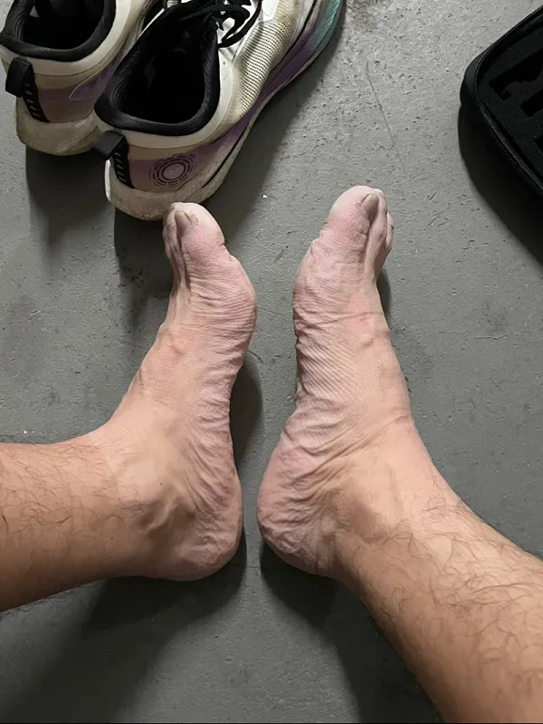 ▲小彭的雙腳長時間浸泡在充滿雨水的鞋子裡,腳底早已皺得不像話