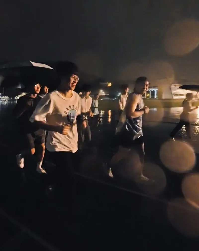 挑戰從下午五點開始,雨便沒有停過,穿著雨衣的小彭也不間斷地跑著。過程中陸續有不少人加入跑步的行列: