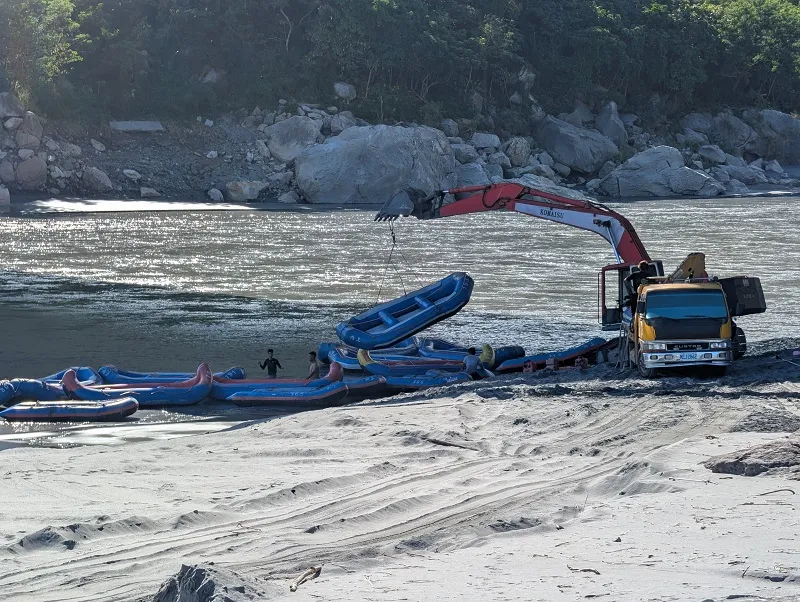 ▲A truck with a crane helping retrieve all of the rafts after our trip