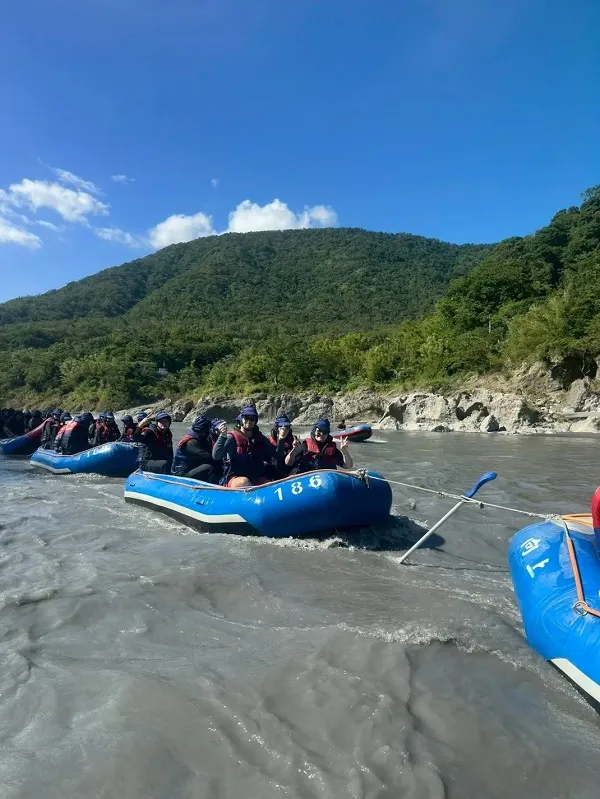 So, after a night of rest, we woke up on National Day (10/10) ready to celebrate the tumultuous birth of the Republic of China with an equally exciting activity: river rafting. We walked a short distance to the local train station to meet the driver who took us to the river rafting center. Shortly after arrival, we had to sign a few forms as well as drop off our loose items into some bags that would be waiting for us at the end of our journey. The staff then efficiently gathered the non-Mandarin speakers for a safety video in English, ensuring we all understood the basics of paddling commands and more. With the essentials of safety fresh in our minds, it was time to gear up. Once we had strapped on our life vests and helmets, we felt secure and ready for the adventure ahead. Now looking the part, we joined the colorful procession making its way down to the riverbank, where a fleet of inflatable rafts bobbed gently in the current, waiting for their crews. One by one, boats loaded with cheering rafters peeled away from the shore, and soon, it was our turn to push off into the cool, clear water of the Xiuguluan River.