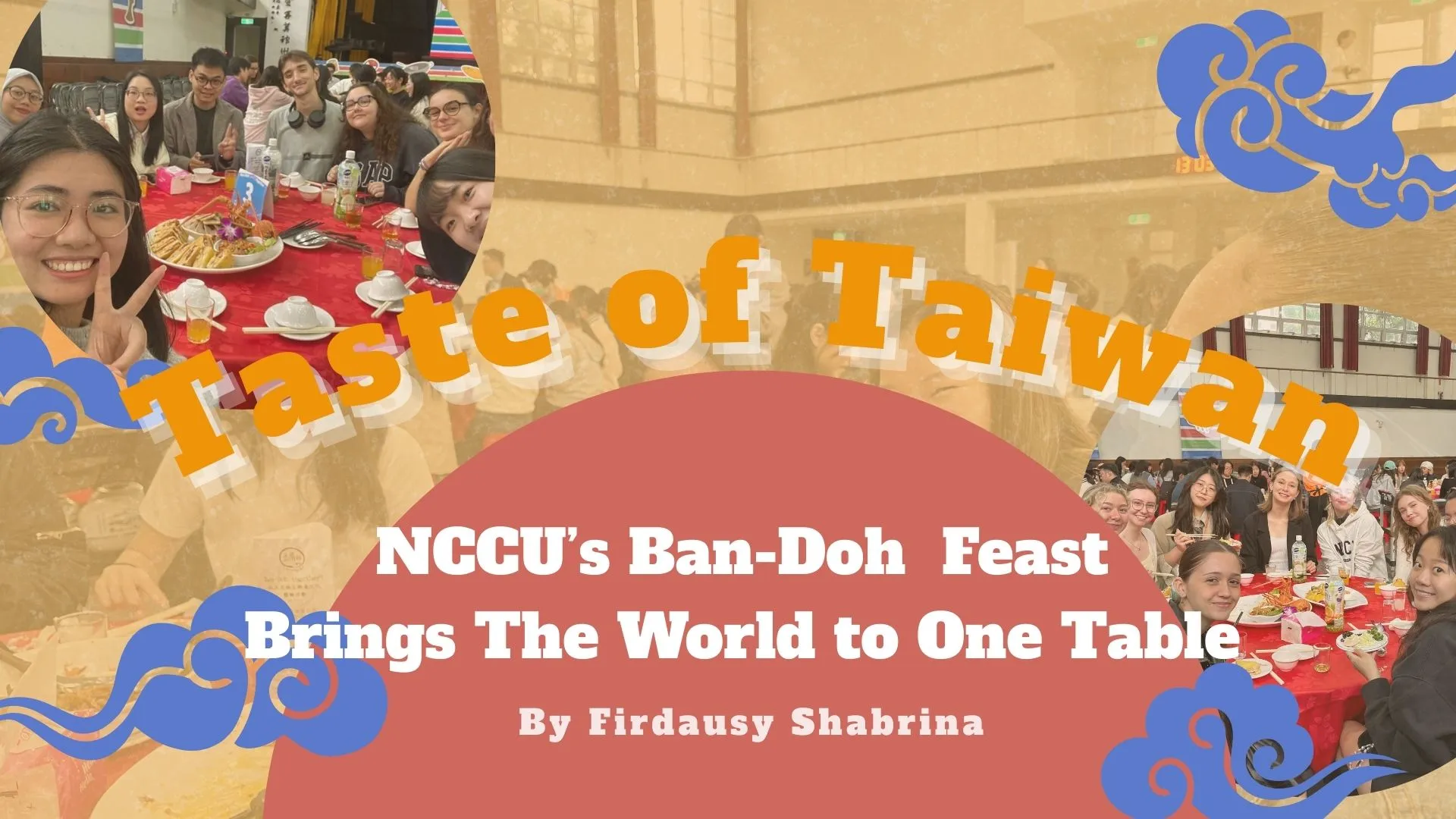 On a bright Saturday morning, November 22, 2025, Si Wei Hall buzzed with laughter, conversations in multiple languages, and the rich aroma of freshly prepared Taiwanese dishes as hundreds of NCCU students, both local and international, gathered for the long-awaited Ban-Doh Feast. The hall was decorated with colorful banners featuring traditional Taiwanese iconic symbols, stylized calligraphy, and festive motifs of Taiwanese traditional things, a warm celebratory glow over the space. Round tables draped in red cloth reflected the traditional colors of joy and good fortune, while a large screen displayed the message “Ban-Doh Together”, setting the lively and festive atmosphere typical of Taiwan’s outdoor banquet culture. Outside the hall, a temporary Ban-Doh kitchen had been set up, adding an authentic touch as steam curled from steaming pots, the sizzle of woks punctuated the morning air, and fragrant aromas of garlic, ginger, and freshly prepared seafood drifted inside, enticing students even before they entered.
