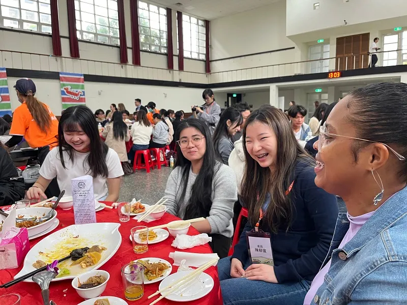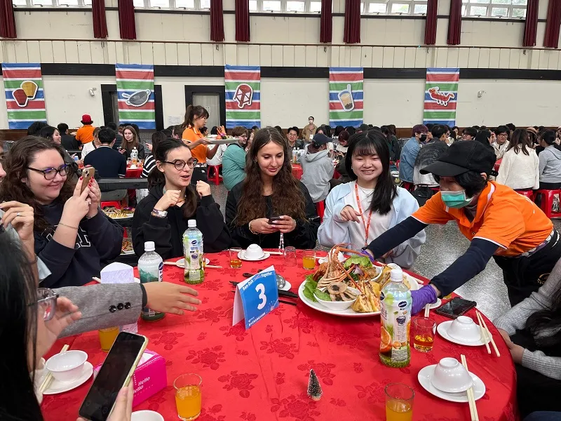 To accommodate the large number of participants, Si Wei Hall was arranged with more than fifteen round tables, each seating around twelve students. The Office of International Cooperation (OIC) placed two Taiwanese student ambassadors from OICSA at every table to guide cultural exchange throughout the meal. These ambassadors were not only guides but also cultural interpreters, explaining the meaning behind each dish, sharing anecdotes about Taiwanese traditions, and gently facilitating conversation among students who had never met before.