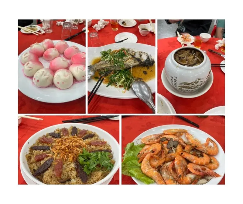 The feast featured a wide array of dishes; Golden Chicken, fresh seafood, Buddha Jumps Over the Wall soup, seasonal vegetables, vegetarian options, Tuí-khòo (pork knuckle), three-layer sandwiches, Oil Rice, thick soup, and more. Each dish was served sequentially, allowing students to appreciate the color, aroma, and texture as they arrived. Chef Huang explained, “Ban-Doh is a banquet, not street food. Everything is made fresh on-site. We started preparing at 4 a.m. Every dish takes time soaking rice, chopping ingredients, stir-frying, and braising. It’s a way to show hospitality and tradition.”