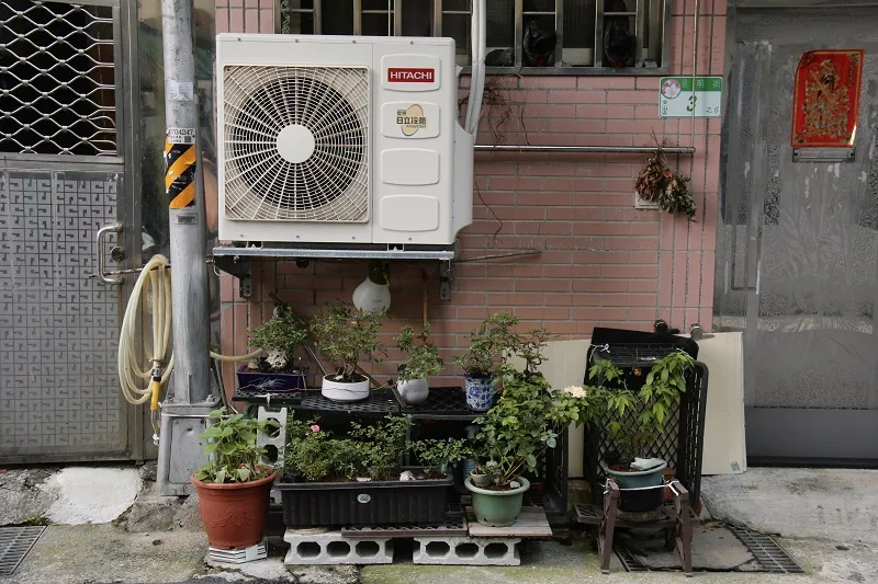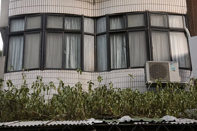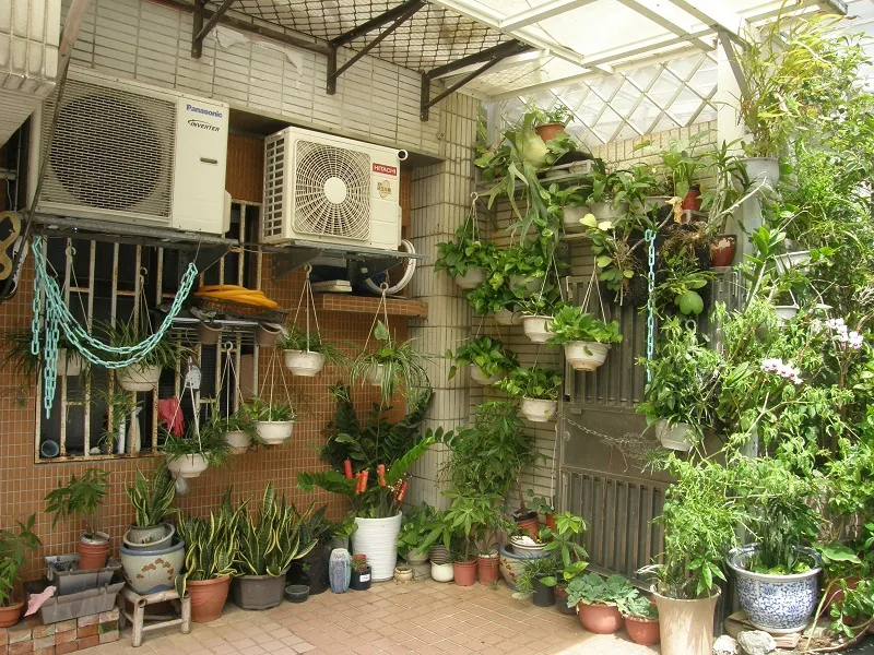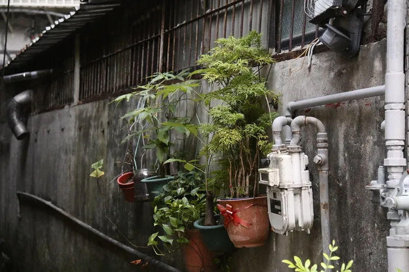▲A typical view of a plant-loving Taipei apartment. Exposed air conditioning units, metal bars, and abundant green life, commingling.