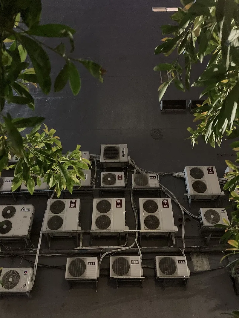 ▲Air conditioning units on the outside of a building connected through wild, almost vine-looking wires and shrouded in plant life.